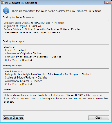 When you open Publishing Manager data with Document Binder, a list of the settings that could not be carried over is displayed.
