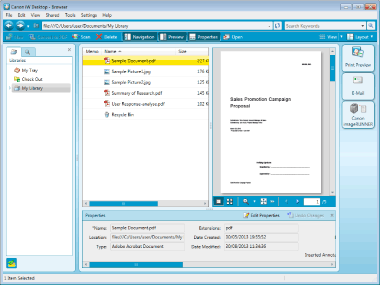 Desktop Browser is in charge of document management and linking external devices/applications. It enables you to centrally manage documents using libraries, check unread/updated documents/newly arrived documents, and preview and search for documents. It can also link with external devices such as imageRUNNER ADVANCE devices and external applications such as Microsoft Office applications to comprehensively support the handling of documents, such as printing, sending and receiving faxes, and attaching to e-mail.