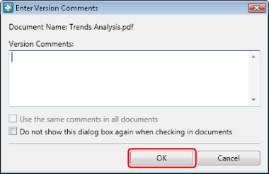 When you enable the version management function for a Document Server Library or SharePoint Server Library, the [Enter Version Comments] dialog box is displayed when you register or update a document in the Document Server Library or SharePoint Server Library.