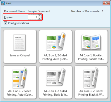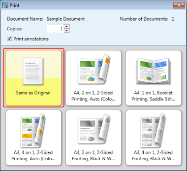 When printing, you can also use print templates registered in Document Binder. Print templates include frequently used print settings registered by default and user-defined ones that you add. For more information on print templates, see the following.