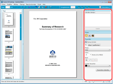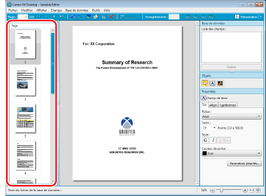 Les « volets » sont les zones de l'écran de Variable Editor utilisées comme zone de travail pour afficher des aperçus, comme zones de sélection de pages et comme zones de définition de champs de variables.
