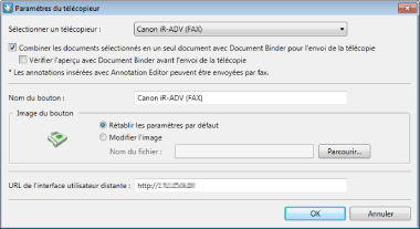 Sélectionnez cette case si vous souhaitez relier plusieurs documents sélectionnés en un seul document dans Document Binder et le télécopier. Si cette case est décochée, l'application externe associée au document démarre après l'opération d'exécution de l'envoi pour effectuer l'envoi de télécopie.