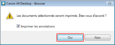 Si, après l’impression, l’application reste ouverte et si le message <Le processus d'impression prend un certain temps, ou il est possible qu'une application prise en charge soit en cours d'exécution. Vérifiez sur l'imprimante si l'impression est terminée. Si une application prise en charge liée aux documents en cours de traitement est en cours d'exécution, quittez l'application prise en charge. Voulez-vous continuer?> s’affiche, sélectionnez [Non].
