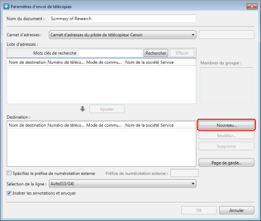 Si vous sélectionnez une adresse ajoutée à [Destination] et cliquez sur [Modifier], la boîte de dialogue [Modifier les nouvelles adresses de destination] s’s’affiche pour vous permettre de modifier l’adresse sélectionnée.
