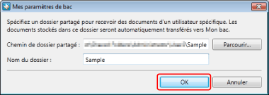 Lorsque vous reconfigurez ou supprimez un dossier déjà enregistré dans Mon bac, celui-ci ne peut pas être configuré ou supprimé s’il y a des documents dans Mon bac. Supprimez les documents qui se trouvent dans Mon bac avant de le reconfigurer ou de le supprimer.