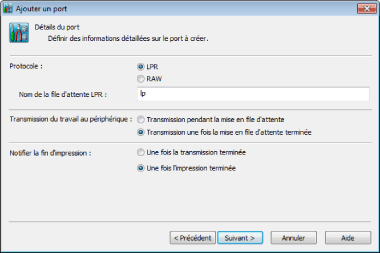Spécifiez l'utilisation du protocole d'impression LPR ou RAW sur l'imprimante configurée. Si le périphérique sélectionné dans la boîte de dialogue [Créer un port] ne prend pas RAW en charge, vous ne pouvez pas sélectionner RAW.