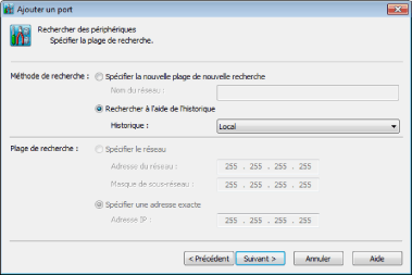 Spécifiez cette option en sélectionnant [Spécifier la nouvelle plage de nouvelle recherche] dans [Méthode de recherche]. En cas de recherche utilisant l'adresse du réseau et le masque de sous-réseau network, sélectionnez [Spécifier le réseau]. Si l'adresse IP est utilisée pour la plage de recherche, sélectionnez [Spécifier une adresse exacte].
