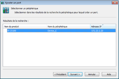 Cliquez sur le périphérique souhaité dans la liste afin de créer un port. Double-cliquez sur les informations du périphérique pour afficher la boîte de dialogue [Créer un port] ou cliquez sur [Suivant].