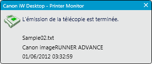 Ce message s'affiche pendant la période allant du début de la mise en file d'attente effectuée par le Windows spooler, jusqu'à la fin d'un travail d'envoi de télécopie à un périphérique.