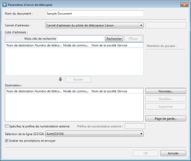 Toutefois, les annotations ajoutées avec une autre application qu'Annotation Editor peuvent être envoyées par télécopie, que la case [Insérer les annotations et envoyer] soit cochée ou non, en fonction du type d'annotation.