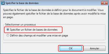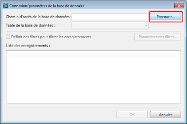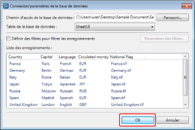 Lorsque vous définissez comme destination de connexion un fichier Excel comportant plusieurs feuilles, vous pouvez sélectionner dans [Table de la base de données] une feuille à utiliser comme base de données.