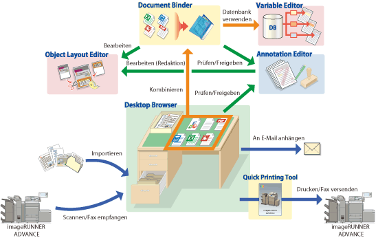 Aus dem Desktop Browser heraus können Sie auf die verschiedenen Desktop-Komponenten zugreifen. Darüber hinaus können Sie über den Document Binder auf einfache Bearbeitungsfunktionen zugreifen. Nach der Installation werden Verknüpfungen zu diesen beiden Modulen im Startmenü (Windows XP/Vista/7) oder im Bildschirm [Start] (Windows 8/Windows 8.1) sowie als Symbole auf dem Windows-Desktop angelegt.