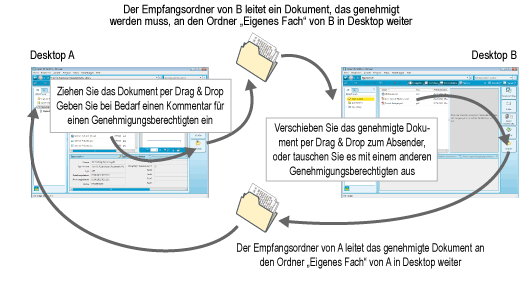 Navigationsbereich. Das Dokument, das Sie per Drag & Drop in das Ordnerausgabesymbol verschieben, wird in den Ordner „Eigenes Fach“ eines Empfängers übertragen. Sie können Dokumente, die im Ordner „Eigenes Fach“ angekommen sind, bearbeiten und verteilen.