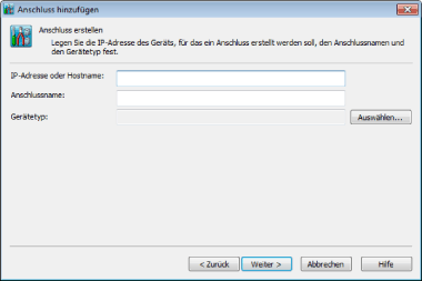 Geben Sie die IP-Adresse oder den Hostnamen eines Geräts ein, das an einem zu erstellenden Anschluss verwendet werden soll. Sie können maximal 127 1-Byte-Zeichen eingeben. Wenn 2-Byte-Zeichen verwendet werden, können Sie maximal 7 2-Byte-Zeichen (14 1-Byte-Zeichen) eingeben.