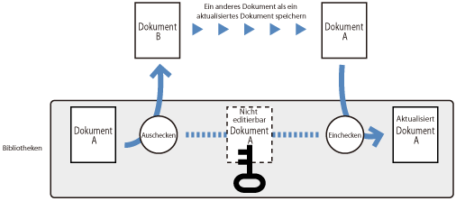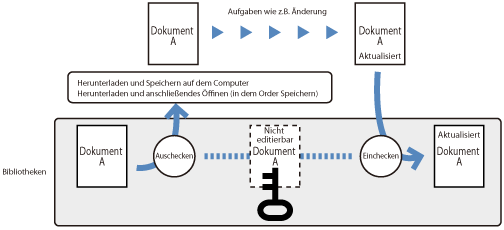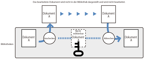 Üblicherweise checkt ein Benutzer ein Dokument zunächst aus einer Bibliothek aus und lädt es anschließend herunter, um es zu bearbeiten. Dadurch werden andere Benutzer daran gehindert, dasselbe Dokument zu bearbeiten, während es vom ersten Benutzer verwendet wird. Andere Benutzer können das Dokument erst bearbeiten, nachdem es wieder eingecheckt wurde oder wenn das Auschecken abgebrochen wurde.