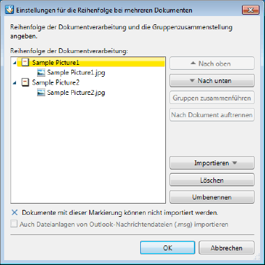 Das Dialogfeld [Einstellungen für die Reihenfolge bei mehreren Dokumenten] wird angezeigt, wenn Sie [Dialogfeld für Dokumentreihenfolge beim Importieren mehrerer Dokumente anzeigen] wählen.