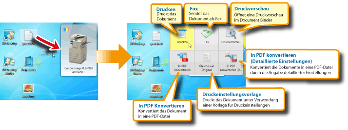 Das Quick Printing Tool ist eine Anwendung, mit der Sie Gerätefunktionen wie Drucken oder Faxversand intuitiver nutzen können. Zudem überwacht es ähnlich wie der Printer Monitor den Status externer Geräte (z. B. imageRUNNER ADVANCE-Geräte) und den Status des Druckvorgangs und verwaltet Protokolle zu Druckvorgängen sowie dem Faxversand und -empfang.