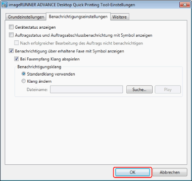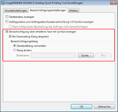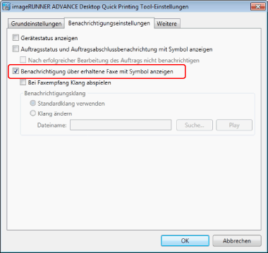 Wenn kein für die Anwendung angegebener Anschluss konfiguriert ist, wählen Sie [Benachrichtigung über erhaltene Faxe mit Symbol anzeigen] und klicken Sie in den Einstellungen auf [OK], um den Anschluss automatisch zu ändern.