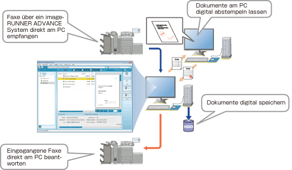 Durch die Kombination der Funktionen von Desktop und Geräten können Sie empfangene Faxdokumente speichern, um sie zu verwalten, ihren Inhalt auf einem Computer prüfen und Kommentare eingeben.
