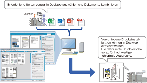 In Desktop können Sie Druckeinstellungen zusammen mit Dokumenten speichern. Dies ermöglicht Ihnen die einfache Durchführung von Druckvorgängen, ohne die Druckeinstellungen erneut angeben zu müssen. Da Dokumente mit unterschiedlichen Dateierweiterungen in Desktop in einem einzelnen Dokument zusammengefasst werden können, können Sie Fehler, wie den versehentlichen doppelten Druck eines Dokuments, vermeiden oder unterschiedliche Druckeinstellungen für Dokumente festlegen.