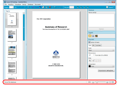 Consente di visualizzare il file di database correntemente collegato e di modificare il fattore di ingrandimento del riquadro di lavoro.