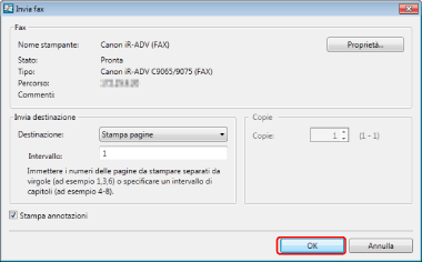 .[Impostazioni] > [Impostazioni sistema] > [Impostazioni comuni] > [Stampa/Invia via fax] > [Stampa/Invia via fax per i documenti con annotazioni inserite] > [Seleziona procedura]
