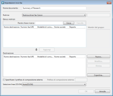 Se si seleziona [Recupera numero di fax quando si invia un fax dalle proprietà di un documento] nelle impostazioni di sistema di Desktop Browser, un numero di fax automaticamente recuperato dalle proprietà del documento appare in [Destinazione] nella finestra di dialogo [Impostazioni invio fax].