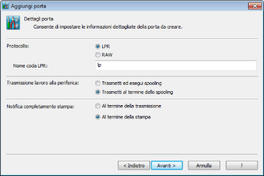 Specificare se viene utilizzato LPR o RAW per il protocollo di stampa nella stampante configurata. Se la periferica selezionata nella finestra di dialogo [Crea porta] non supporta RAW, non è possibile selezionare RAW.