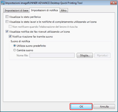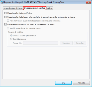Selezionando [Cambia suono], il segnale acustico specificato per [Nome file] viene impostato come suono di notifica. In [Nome file] è possibile specificare un file sorgente preferito in formato wav/wave facendo clic su [Sfoglia].