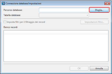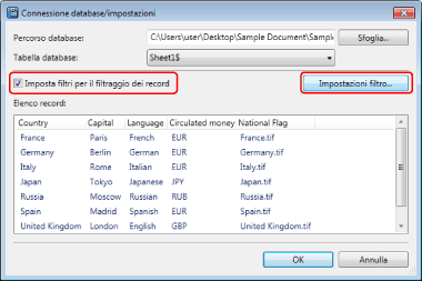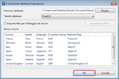 Se si imposta un file Excel con più fogli come destinazione di collegamento, è possibile selezionare un foglio da utilizzare come database in [Tabella database].
