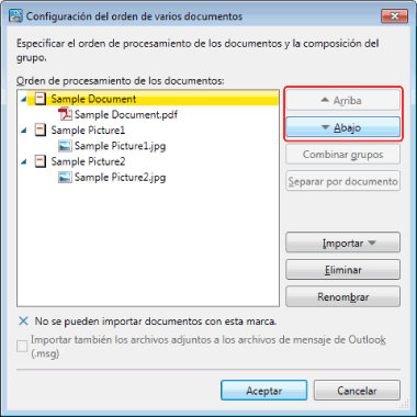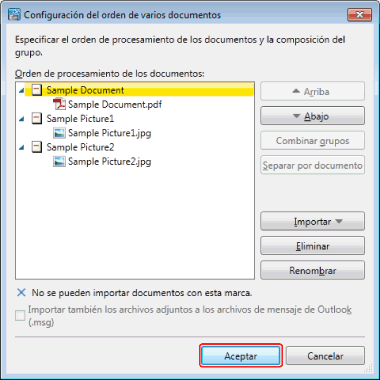 [Configuración del orden de varios documentos]: Muestra el cuadro de diálogo [Configuración del orden de varios documentos].