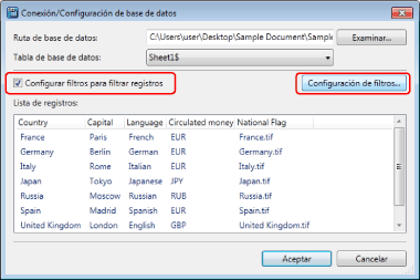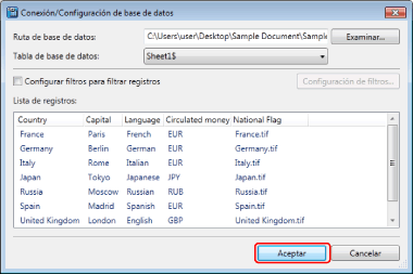 Al configurar un archivo Excel con varias hojas como destino de conexión, podrá seleccionar una hoja para utilizarla como base de datos en [Tabla de base de datos].