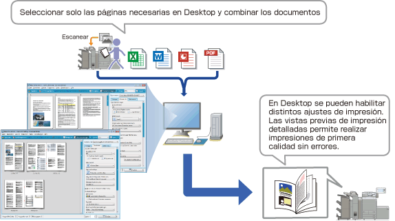 Con Desktop, puede guardar los ajustes de impresión junto con los documentos. Esta característica le facilita la impresión, ya que no necesitará volver a especificar los ajustes. Dado que en Desktop es posible combinar documentos de distintas extensiones en uno solo, puede evitar errores como imprimir dos veces el mismo documento o especificar distintos ajustes.