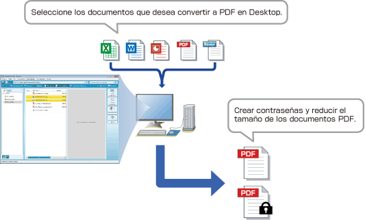 Con Desktop, puede convertir documentos de distintos formatos en documentos PDF y fusionar varios documentos en un solo documento PDF. También puede crear una contraseña para los documentos PDF y mejorar así su seguridad.
