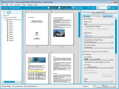 Document Binder can put together document files that have been saved with various application programs into one "Binder Document." A Binder Document enables you to set an index and header/footer, change the order of content inside the document, and delete unnecessary pages. Document Binder is also the module in charge of printing for Desktop. It enables you to specify various print format settings, and register/manage frequently used settings as print templates. It also has a function for reducing document margins to save paper.