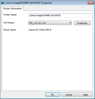 The name of the configured printer's port is displayed. By selecting the port from the list, you can change the port. However, a maximum of 32 printers can be assigned to an application-enabled port.