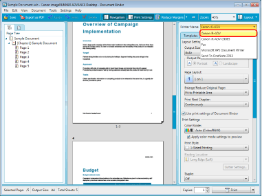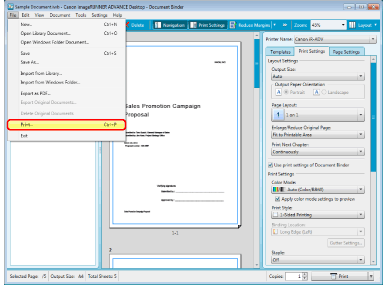If you are using a binder document, the print settings stored in the binder document are used when printing. For details on the print settings, see the following.