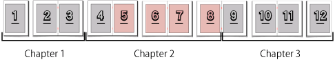If the original document is composed of three chapters/12 pages and the third chapter's color mode is set to [Black & White], the pages on the same sheet of paper (pages 1-4) as the third chapter are also printed as [Black & White].