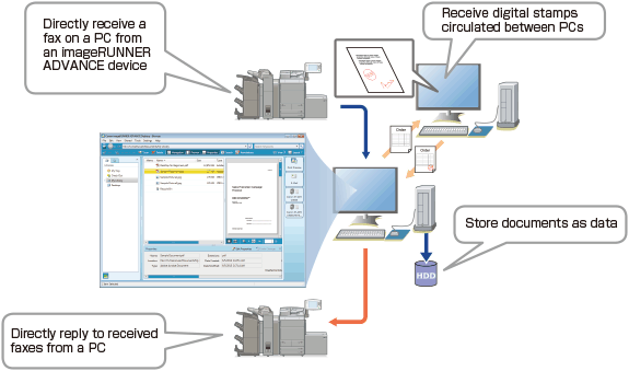 By combining the functions of Desktop and devices, you can save received fax documents as data to manage them, check their content on a computer, and enter comments.