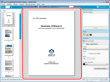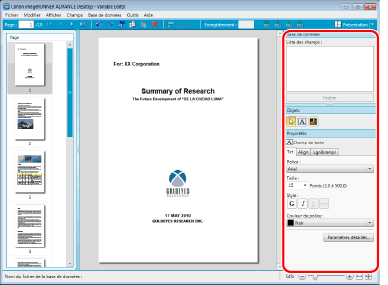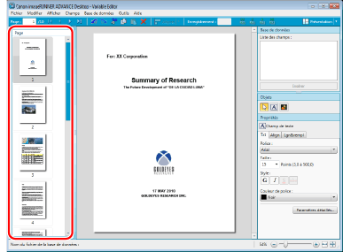 Les « volets » sont les zones de l'écran de Variable Editor utilisées comme zone de travail pour afficher des aperçus, comme zones de sélection de pages et comme zones de définition de champs de variables.