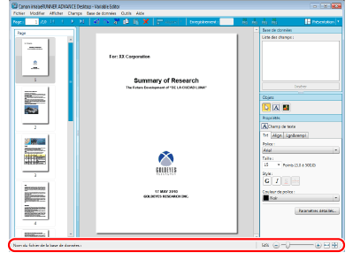 Vous permet d'afficher le fichier de base de données actuellement connecté et de modifier le facteur d'agrandissement du volet de travail.