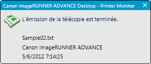 Ce message s'affiche lorsque la télécopie a été envoyée avec succès.