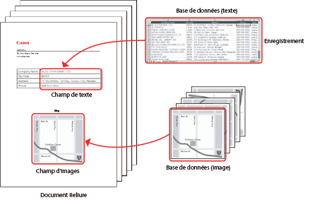 Les données remplaçables sont dénommées "enregistrement". Elles peuvent utiliser des données provenant de carnets d'adresses ou de bases de données.