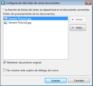 Aparecerá el cuadro de diálogo [Configuración del orden de varios documentos] cuando se selecciona la casilla de verificación [Seleccionar el orden de procesamiento de documentos al convertir los documentos seleccionados a un documento PDF único].