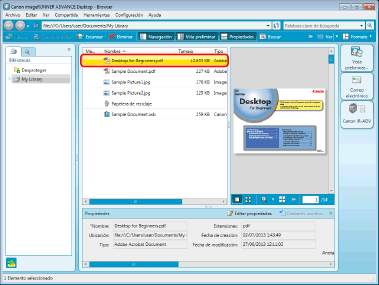 Cuando arrastre y suelte un documento, se puede mostrar el cuadro de diálogo [Print] de la aplicación utilizada para crear el documento o el cuadro de diálogo [Printing]. En ese caso, seleccione [Desktop Document Writer] en la impresora de salida e imprima.