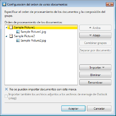 El cuadro de diálogo [Configuración del orden de varios documentos] aparece al seleccionar [Mostar cuadro de diálogo para la configuración del orden de documentos al importar varios documentos].