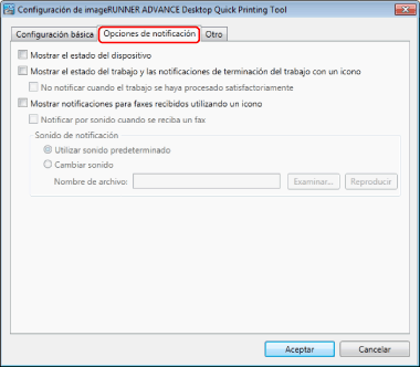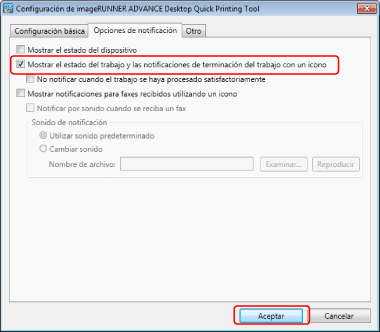 Si no se ha configurado un puerto activado de aplicación, seleccione [Mostrar el estado del trabajo y las notificaciones de terminación del trabajo con un icono] y, a continuación, haga clic en [Aceptar] en los ajustes para cambiar el puerto de forma automática.