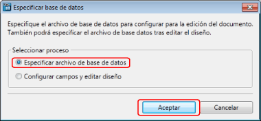 Si desea únicamente crear el diseño y posteriormente importar la base de datos, seleccione [Configurar campos y editar diseño] y haga clic en [Aceptar]. Se mostrará la pantalla Variable Editor.