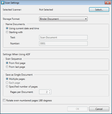 Configure the document name in "<text><serial numbers from the starting number>.<extension>" format using the character strings specified in [Text] and the number specified in [Number].