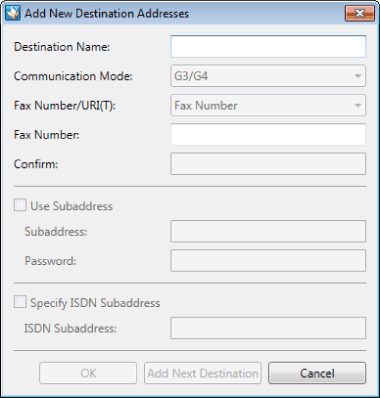 Click to configure another destination address. The destination address you entered is reflected in [Destination], and a new [Add New Destination Addresses] dialog box is displayed.